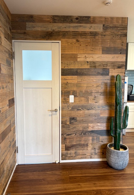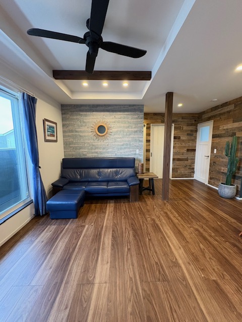 明るく開放的なリビング!天然木を施した壁が素敵です。